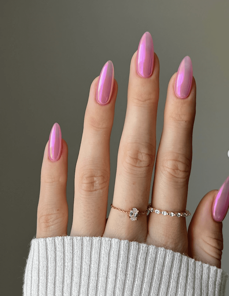 Pink chrome nails are still having a major moment, and almond shapes make them look extra elegant. I love pink chrome almond nails for special occasions or when I want my nails to feel elevated but not over-the-top. They’re glossy, reflective, and perfect if you’re into pink nails chrome with a modern twist.