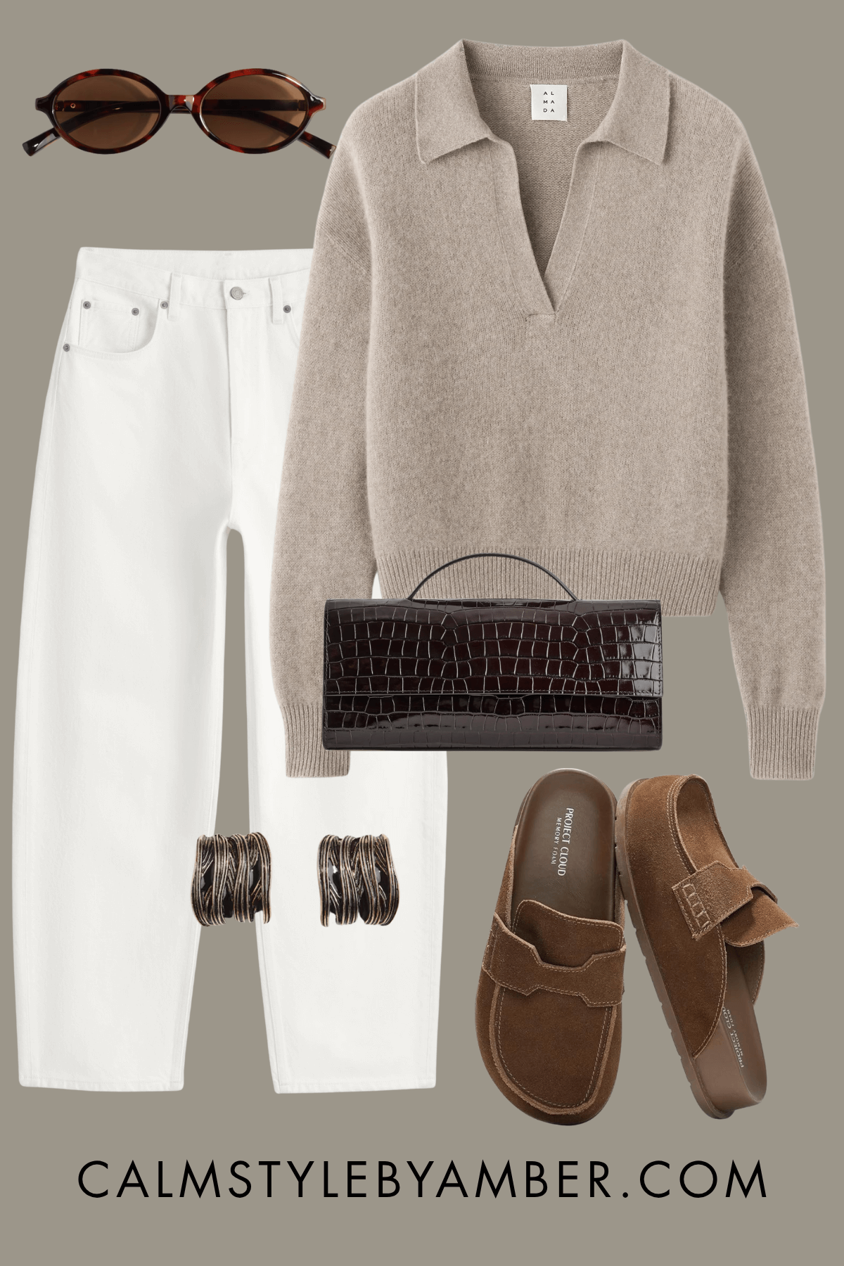 The best sweaters to wear with barrel jeans are ones that balance the wider silhouette of the pants. Fitted or slightly cropped sweaters help define your waist and create a flattering shape. Tucking in lightweight knits, ribbed sweaters, or turtlenecks works especially well.