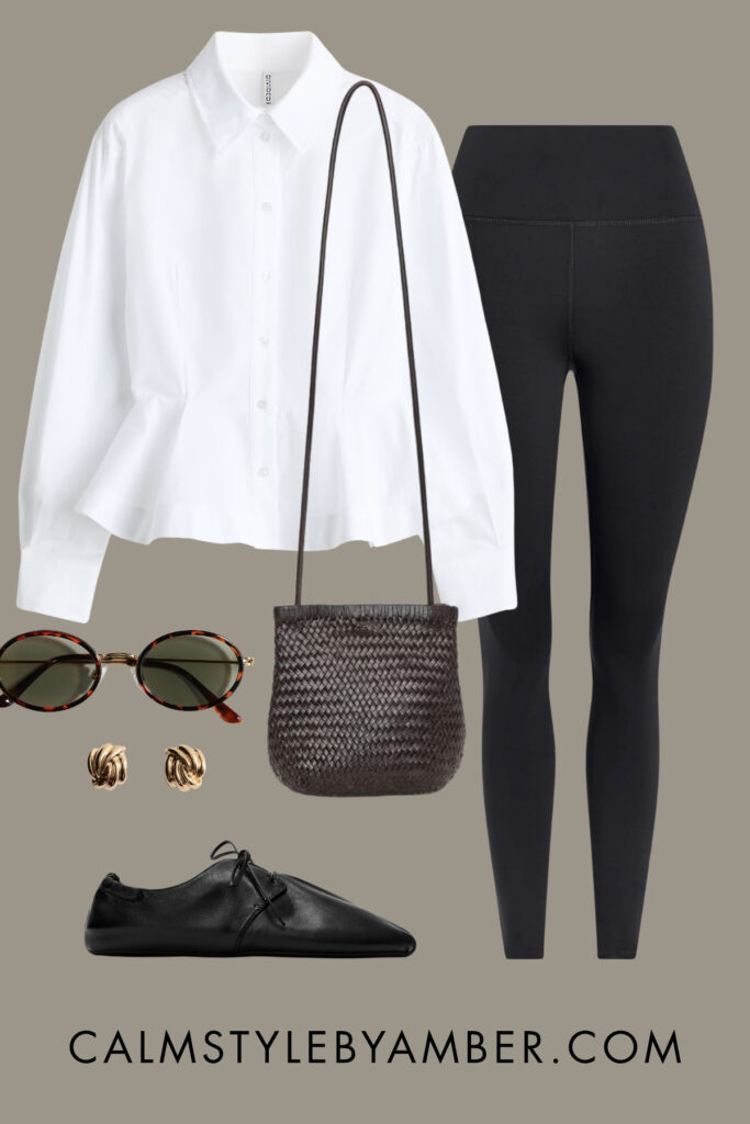 Finish with sleek white trainers or pointed-toe flats. This is a leggings outfit idea that works beautifully for coffee runs, casual Fridays, or any day you want to look like you have it together without actually having it together.